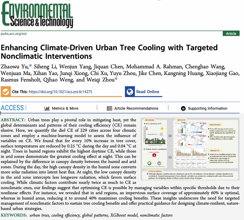 近日,我系余兆武团队联合国内外多所高校及科研机构,在全球城市热岛效应缓解策略研究领域取得重要进展。相关成果以Enhancing Climate-Driven Urban Tree Cooling with Targeted Nonclimatic Interventions为题,发表于环境领域国际顶级期刊Environmental Science & Technology。该研究通过全球多尺度数据分析与机器学习模型,揭示了不同气候区城市树木降温效率的时空分异规律,并提出优化非气候因素以提升降温效益的创新路径,为全球城市绿地规划提供了科学依据。