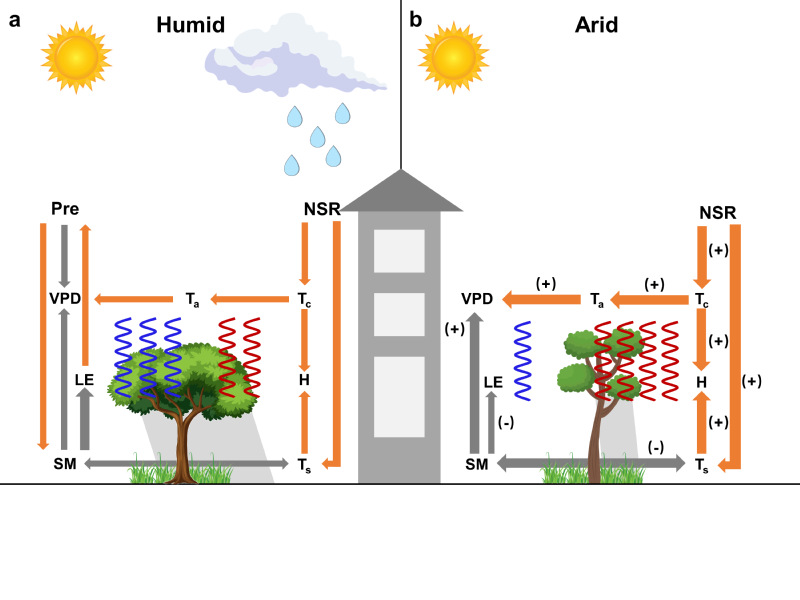 图1 城市树木降温效率在全球干旱与湿润地区机制图