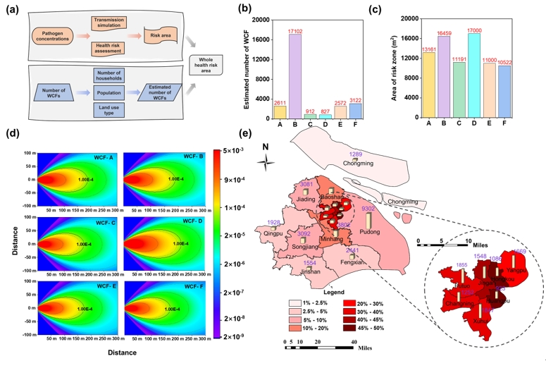 潜在风险区:此外,研究还指出,约 6.3% 的上海区域(面积约为 400 km²)处于 WCFs 排放影响的潜在风险区内。尽管单个 WCFs 的风险区域相对污水处理厂较小,但考虑到城市中 WCFs 数量众多,其对公众健康的累积影响不容忽视。以上海为例,WCFs 数量超过 20,000个,远远多于污水处理厂的数量,因此其对公共卫生的影响更为广泛。