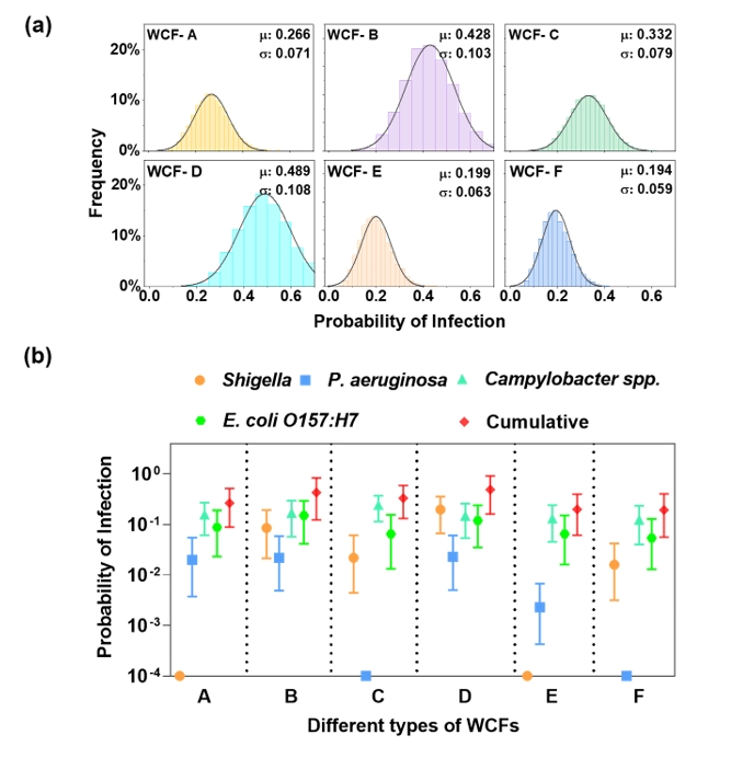 评估传播风险:在病原体传播和健康风险评估方面,研究人员运用修正的高斯羽流扩散模型对病原体传播进行模拟。结果表明,下风向的病原体浓度随着与 WCFs 距离的增加而逐渐降低,在距离 WCFs 220 米处,健康风险达到了可接受范围的临界阈值,这一距离界定了病原体扩散的最大范围。对垃圾处理工人的健康风险评估显示,其每年因接触 WCFs 排放病原体而感染的风险在 0.194 - 0.489 之间,远远超过了世界卫生组织规定的可接受感染风险上限(10⁻⁴) 。不同类型的 WCFs 以及不同的参考病原体,其感染风险存在明显差异,例如菜市场 WCFs 的感染风险相对较高,而弯曲杆菌在各类 WCFs 中引发的感染风险尤为突出。