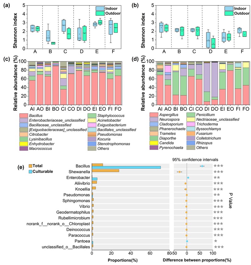 微生物群落解析:研究结果显示,WCFs 周边的微生物群落结构呈现出复杂的特征。在可培养细菌方面,多数 WCFs 内部的物种丰富度高于外部,但郊区的 WCFs 出现了相反的情况,这可能与郊区 WCFs 靠近农田,微生物来源更为多样有关。相比之下,真菌的物种丰富度在室内外环境的差异并不显著。进一步分析发现,不同区域的 WCFs 微生物群落结构存在明显差异,例如居民区和菜市场的细菌群落具有较高相似性,而郊区的细菌群落结构独特。在微生物种类上,芽孢杆菌(Bacillus)和曲霉(Aspergillus)分别在细菌和真菌中占据优势地位。值得注意的是,在菜市场的 WCFs 中,脉孢菌(Neurospora)的丰度显著高于其他区域,这可能与菜市场垃圾中富含碳水化合物等营养物质有关。