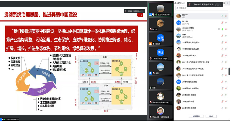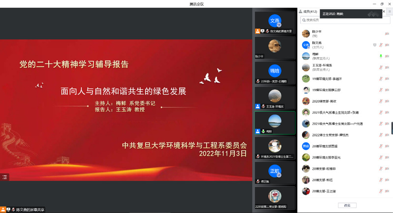 梅鲜同志向全体党员介绍了环境系系党委二十大精神学习计划,第一是要求大家打好自学基础,原原本本学原文,包括二十大报告,新党章等重要文件;第二是在自学基础之上,参加辅导报告;第三是集中学习,通过中心组学习、书记讲党课、专题组织生活会、教职工理论学习等等方式展开研讨。另外,在条件允许的情况下,以支部为单位组织实地研学。