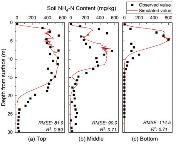 图三:稀土矿山顶部、中部和山脚处土壤NH4-N的垂向分布模拟与监测结果比较