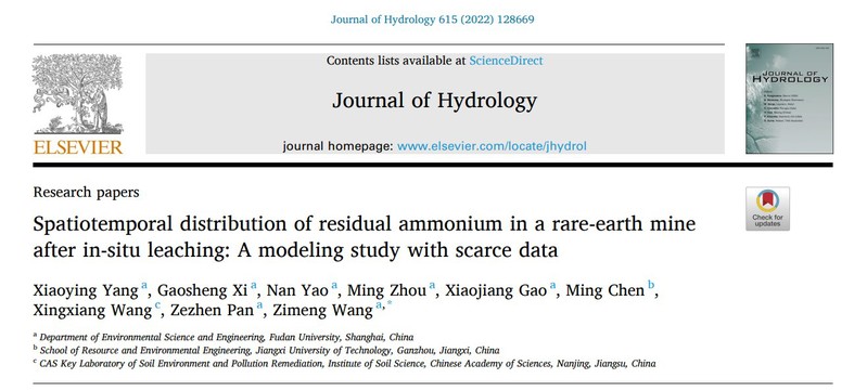 以上研究(Spatiotemporal distribution of residual ammonium in a rare-earth mine after in-situ leaching: A modeling study with scarce data)发表在水文学领域的顶级期刊Journal of Hydrology,该研究获得国家重点研发计划项目、国家自然科学基金等项目支持。本文第一作者杨晓英为笔趣阁 环境系副教授,长期从事流域水环境模拟、流域污染控制、气候变化与流域水安全领域的研究工作。通讯作者王梓萌研究员为笔趣阁 环境系水土界面过程研究团队负责人,从事环境地球化学和污染物迁移转化研究,并任Applied Geochemistry执行主编。高效江副教授、潘泽真青年副研究员参与了本项研究。中科院南京土壤所,江西理工大学作为项目及课题牵头单位为研究提供了技术、样品和场地支持。