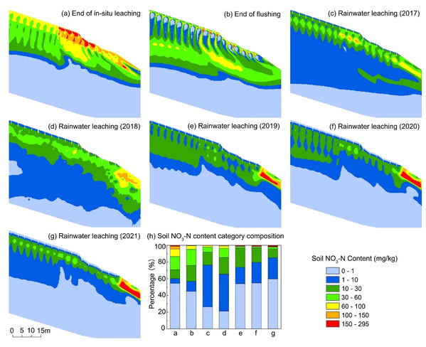 图六: 土壤NO3-N在原地浸矿、人工冲洗和雨水淋滤过程后的空间分布