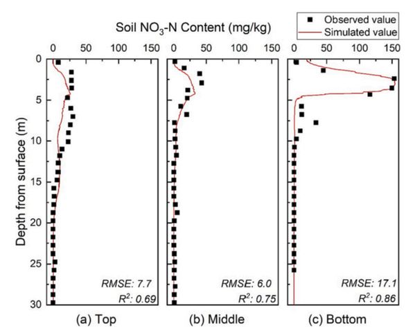 图四:稀土矿山顶部、中部和山脚处土壤NO3-N的垂向分布模拟与监测结果比较