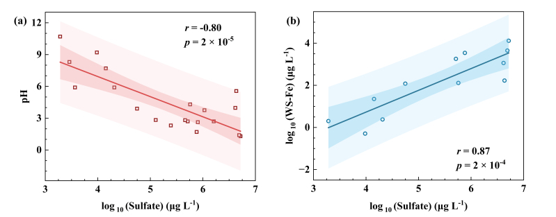 图3. 硫酸根浓度与pH(a)和水溶性铁浓度(b)的相关性分析。