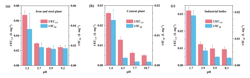 图1. 来自典型钢铁厂(a)、水泥厂(b)和工业锅炉(c)颗粒物的氧化应激效应和细胞毒性随酸度的变化 (原始颗粒物上清液的pH值分别为9.2、10.7和8.3;1/EC1.5和1/IC20分别表征氧化应激效应和细胞毒性,其值越高说明毒性越强)