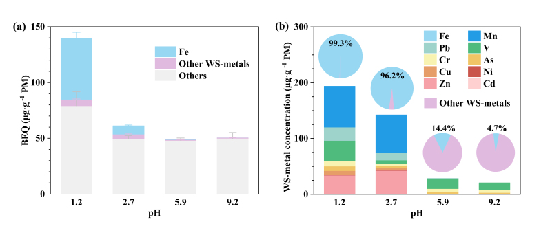 图2. 酸化颗粒物中水溶性金属的生物分析等效浓度(a)和质量浓度(b)颗粒物源于钢铁烧结过程;Other WS-metals包括Mn、Pb、V、Cr、As、Cu、Ni、Zn和Cd;(b)中的饼图显示水溶性铁和其他水溶性金属质量浓度的相对比例
