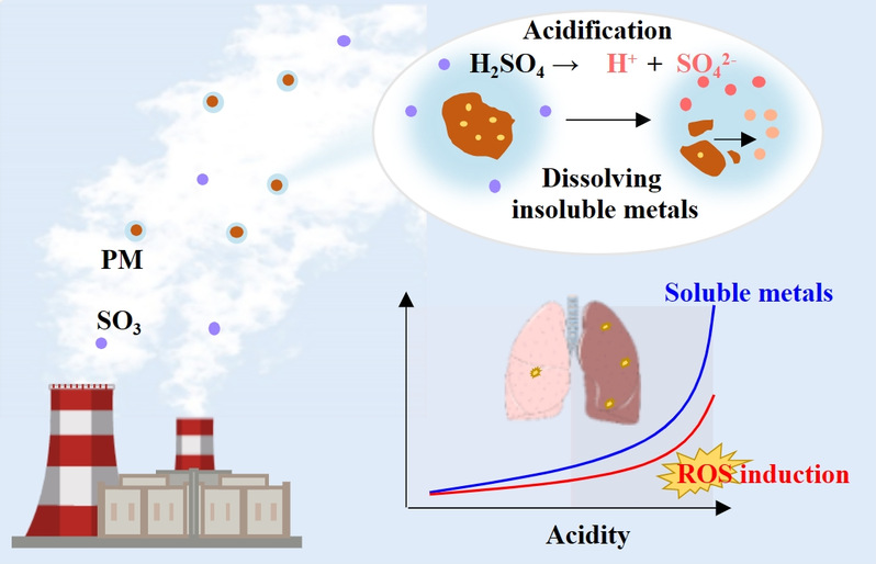 燃煤过程排放的硫氧化物(SO2,SO3)经大气转化后生成的硫酸或硫酸盐,是大气颗粒物中重要的无机成分。北京和伦敦在工业化过程中,均经历严重雾霾事件。然而,北京雾霾造成的死亡率及死亡人数远不及伦敦烟雾。这可能是由于北京雾霾演化时,硫氧化物等酸性气体与氨气反应,生成弱酸性的硫酸铵,极大程度上缓解了酸度对健康的影响。虽然近年硫氧化物被“超低排放”有效控制,但它们仍是工业白色烟羽中主要的酸性气体。这些气态前体物在排放过程转化为酸性颗粒物,与共排放的金属混合,并可能促进金属在颗粒物中的溶解。因此,需要从源排放颗粒物的酸度出发,探究不同酸度对颗粒物毒性效应的影响,从而理解酸度影响健康的机制。