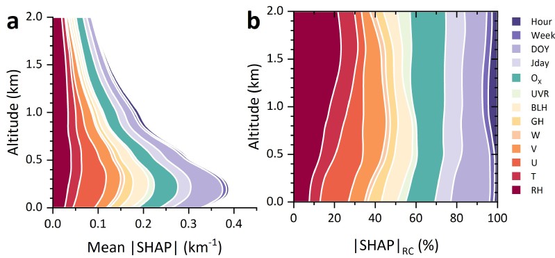 多因子解析与区域传输影响: 通过SHAP 可解释机器学习模型和气象归一化分析,团队定量识别了不同高度气溶胶的主导驱动因子。低空(<0.5 km)的气溶胶主要由人类排放、东西向传输和大气氧化驱动,贡献度超过 60%;高空(>0.5 km)则以相对湿度和大气氧化为主导,贡献度达 55% 以上,反映出吸湿增长和二次气溶胶形成是高空污染的关键机制,且 0.5-1.6 km 高度受南北向传输影响显著,华北地区污染物可通过高空输送至上海,影响中层气溶胶分布。