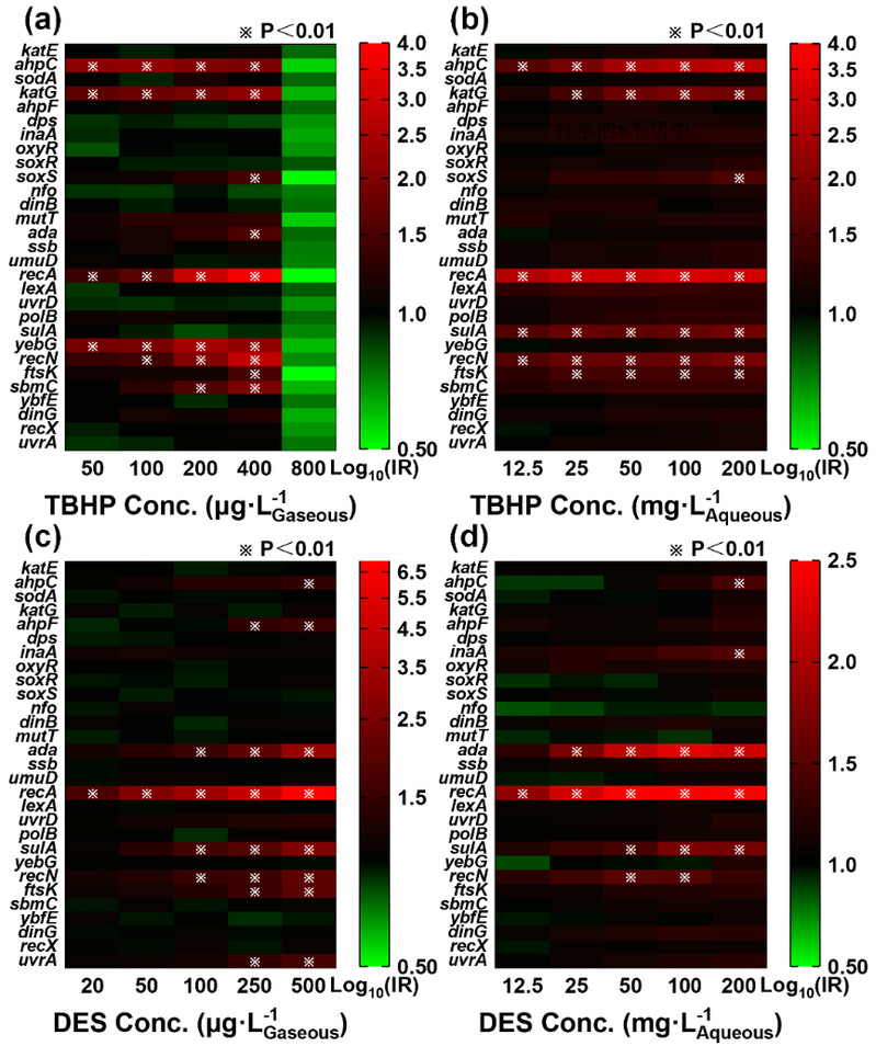 图1. TBHP 和 DES 在气相和水相中的不同遗传毒性。(a) 气态 TBHP、(b) 水性 TBHP、(c) 气态 DES 和 (d) 水性 DES 中所有遗传毒性途径相关基因的热图。