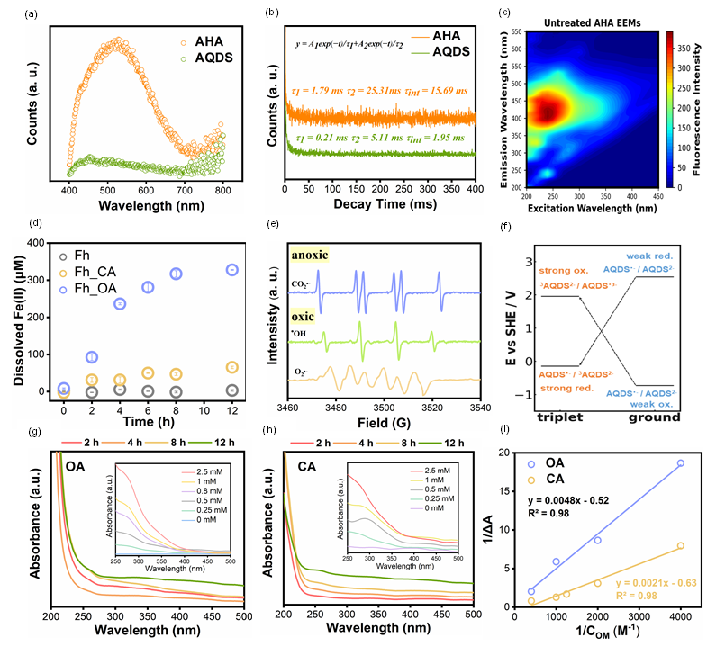 图2. 光诱导电子转移的光谱与计算证据。AHA与AQDS的磷光发射光谱(a)及其三线态寿命衰减曲线拟合(b);AHA初始三维荧光光谱图(c);不同体系中Fe(II)生成量(d);铁–柠檬酸/草酸体系的EPR图谱(e);AQDS由基态到三线态的DFT计算电位变化(f);水铁矿和有机物共存体系紫外-可见光吸收(g);不同配体浓度(0–2.5 mM)UV-Vis变化;(i)Fe(III)–OA和Fe(III)–CA络合物的Benesi–Hildebrand 拟合结果。
