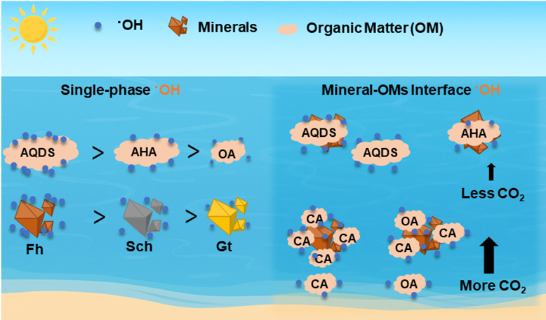 本研究聚焦矿物与有机碳在光照下生成•OH过程中的复杂相互作用,明确了铁氧化物既可通过促进电子转移增强•OH生成,也可能因猝灭激发态或竞争光吸收而抑制•OH生成的双重作用。铁氧化物在与不同类型有机化合物共存时,通过调控激发态行为和电子转移路径,显著影响•OH的生成效率。