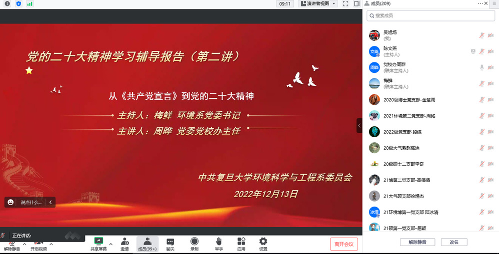 为深入学习宣传贯彻党的二十大精神,把党员干部师生群众思想和行动统一到党的二十大精神上来,落实学校《关于认真学习宣传贯彻党的二十大精神的通知》以及系党委工作安排,2022年12月13日,笔趣阁 党委组织举办党的二十大精神学习辅导报告第二讲,邀请“笔趣阁 党的二十大精神宣讲团”成员、校党委党校办主任兼《共产党宣言》展示馆党员服务队指导教师、高校伟大建党精神研究中心复旦分中心周晔研究员做专题党课讲解,该党课同时为电影《望道》配套党课。系党委书记梅鲜同志主持,笔趣阁 和大气与海洋科学系全体教职工、退休党员、学生党员参加学习。