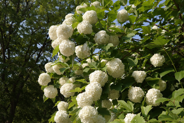 忍冬科荚蒾属;单叶对生为卵形或椭圆形,前端稍钝,基部为圆形,边缘有细锯齿,下面有稀疏的星状毛;木本绣球的树姿舒展,开花时白花满树,犹如积雪压枝,十分美观,宜植栽在堂前屋后、假山岩石、墙下窗外,也可丛植于路旁林缘等处。