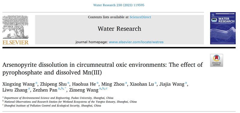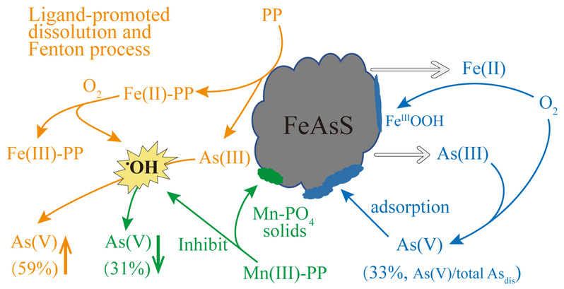 砷作为一级致癌物,其对地下水的污染已经使全球数百万人的生命健康受到威胁。人为源和自然源的砷共同造成了高浓度的地下水砷含量,硫化砷矿物的溶解被认为是砷释放到地下水环境中的一个重要原因。在Mindat矿物数据库中已发现的三百多种含砷硫化矿中,砷黄铁矿(也叫毒砂矿)是在自然界中最为常见的,并且广泛存在于废弃的尾矿中。砷黄铁矿的氧化产物包括硫酸、亚砷酸盐(As(III))和砷酸盐(As(V)),是地表径流和酸性矿山废水(acid mine drainage,AMD)中砷污染的重要源头。砷黄铁矿还普遍存在于地下环境中,受自然破坏、季节性地下水位的波动或人为活动(如管理的含水层补给带来氧化剂)的影响,砷黄铁矿的氧化溶解会变成不可忽略的砷污染来源。因此,研究砷黄铁矿的溶解行为对于深入了解砷的地球化学归趋和其地下水污染的有效控制等方面具有重要意义。此外,溶解态Mn(III)因其较强的氧化还原活性受到了广泛关注,但Mn(III)在与铁和氧共存的复杂多元体系中对天然来源砷的释放过程及其转化的作用尚不清晰。基于此,我系水土界面过程研究团队探究了溶解态Mn(III)对砷黄铁矿溶解的影响,相关成果以“Arsenopyrite dissolution in circumneutral oxic environments: the effect of pyrophosphate and dissolved Mn(III)”为题发表于Nature Index指数期刊Water Research期刊:。