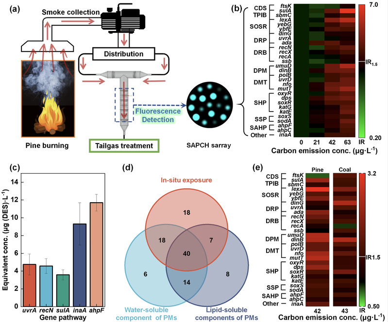将基于SACPH气态暴露系统用于燃烧源烟雾现场毒性测试,其中松木燃烧烟雾在低浓度下抑制了DNA损伤相关基因的表达,而在高浓度下显著诱导了氧化应激和DNA损伤。气态松木烟雾的遗传毒性和氧化应激的硫酸二甲酯当量浓度分别为4.29 μg/L和10.5 μg/L。相比之下,商业煤燃烧烟雾对毒性路径的影响较少,且其氧化应激和SOS响应分别仅为松木烟雾的51.18%和73.91%。这表明使用商业煤燃料比生物质燃料对健康风险的影响更小。