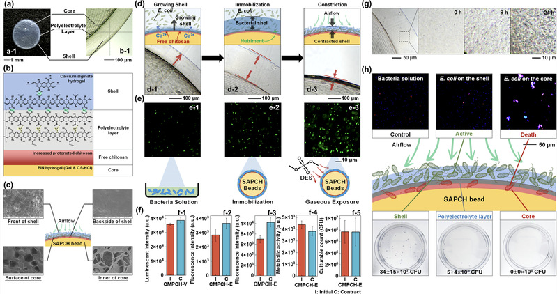 SAPCH微球具有透明的三层核壳结构。核心具有较大的溶胀能力和较低的脱水倾向,而壳层则相反,因此导致壳层在稳定过程中因核心膨胀而首先收缩。化学结构分析表明SAPCH微球从内到外依次为:由明胶和壳聚糖(CHs)组成的交联水凝胶核心;CHs层;CHs与海藻酸钠的聚电解质层;钙海藻酸水凝胶外壳层。细菌通过钠海藻酸与Ca²⁺交联被动固定,并在核心持续释放的营养物质支持下存活和繁殖。空气吹扫后,壳层快速失水并收缩,细菌因此高密度固定于薄薄的水凝胶层,暴露于气液界面。荧光检测程序通过测量固定在壳层中细菌产生的光学信号变化,实现对空气污染物引起的特定基因毒性或氧化应激进行定量化评估。此外,SAPCH微球在合适条件下(37°C,70%湿度)可支持细菌存活繁殖24小时,并保持理想的机械强度。