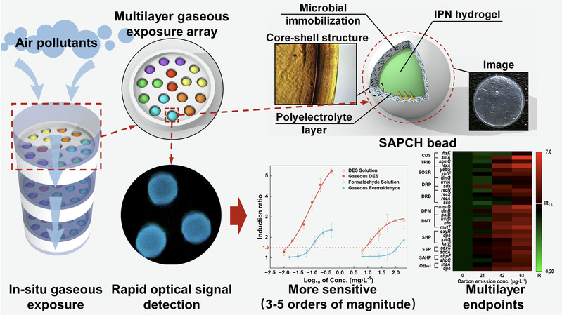 空气污染是导致环境健康风险的主要因素,迫切需要进行现场毒性评估。基于细菌的生物测定方法提供了成本效益高且快速的毒性评估。然而,这些生物测定方法在空气毒性评估中的应用一直具有挑战性,因为细菌直接暴露于空气污染物时其生存和功能不稳定。在这里,我们开发了一种使用自组装被动定植水凝胶(SAPCH)进行现场空气毒性评估的方法。SAPCH具有核壳结构,能够在其壳上定量固定细菌,同时从其核心持续提供养分。核与壳之间的抗菌多聚电解质层限制了细菌在空气-液界面的活动,同步了细菌的生存与暴露于空气污染物。SAPCH固定了一系列天然和重组的发光细菌,能够在2小时内同时检测空气污染物的各种毒理学终点(细胞毒性、遗传毒性和氧化应激)。其灵敏度比传统的液相毒性测试高出3-5个数量级,并且成功评估了挥发性有机化合物和燃烧烟雾的毒性。本研究提出了一种现场、快速、经济的空气污染毒性评估方法,为未来的空气质量监测和控制做出了重要贡献。