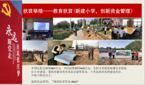 中国证监会捐资900万元,中国结算捐资600万元,支持义务教育标准化学校张庄小学建设,委托河南省扶贫基金会管理资金,兰考县政府承担建设责任。同时创新“财政扶贫资金+NGO”资金管理模式
