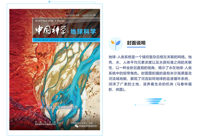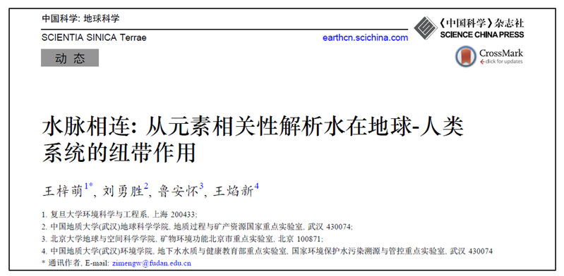 在国家自然科学基金和中国科学院地学部学科发展战略研究项目的资助下,我系王梓萌教授与项目负责人,中国地质大学(武汉)校长王焰新院士、北京大学鲁安怀教授、长江大学校长刘勇胜教授联名在《中国科学·地球科学》杂志上撰文,展示项目研究成果。文章以“水脉相连”为主题,以直观的“元素相关性”分析为切入点,从新颖的角度解析了水圈和水循环在地球-人类系统的纽带作用。论文以中英双语发表,并被选为2023年10月期的封面。