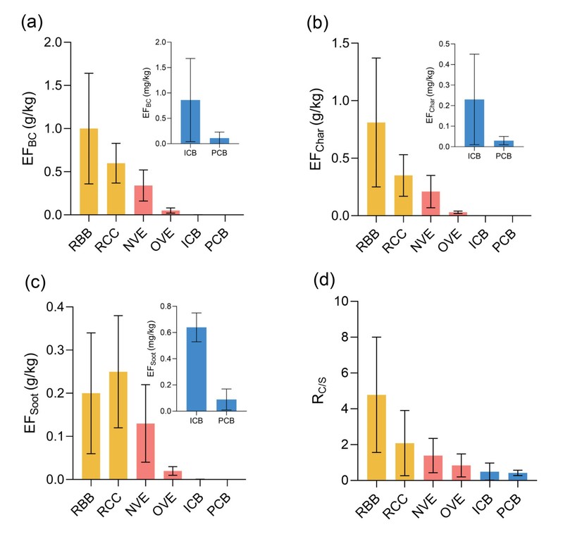 对源排放的实际测量结果显示,排放源的燃烧温度越低,BC的排放因子相对越高,且Char占BC排放的比例也更高。在民用炉灶燃烧中,Char贡献了超过80%的BC排放,而在机动车与非道路交通工具的尾气中,Char与Soot对BC排放的贡献基本一致。而在高温的燃煤锅炉与发电厂排放中,Char仅贡献了BC排放的30%。
