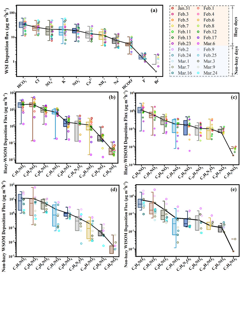 图 4. 霜冻事件期间水溶性无机(WSI)化合物的平均沉降通量(a)。雾霾天气条件下 WSOM(b)和 WISOM(c)中含氮有机物的平均沉积通量,非雾霾天气条件下 WSOM(d)和 WISOM(e)中含氮有机物的平均沉积通量。