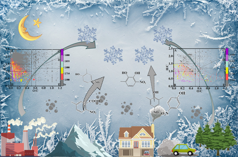 2、含氮有机化合物(NOCs)在霜冻中的比例较高,其中硝基酚(如4-硝基苯酚)及其衍生物是最丰富的NOCs,其湿沉降通量在霾天显著增加,与PM2.5浓度呈正相关。